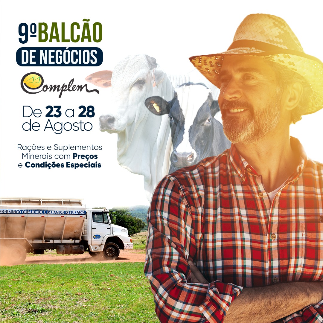 Serão seis dias de muitos negócios e oportunidades incríveis. De 23 a 28 de agosto a Complem vai realizar a 9ª Edição do tradicional Balcão de Negócios. Uma ação voltada à negociação de toda linha de nutrição animal para atender ao cooperado e ao pecuarista em geral de toda a região atendida pela Cooperativa. Ao oferecer condições especiais de preço e pagamento, o balcão de negócios tem também o objetivo de estimular o oferecimento de suplementação de qualidade ao rebanho neste período.