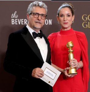 PREMIADO NO GLOBO DE OURO 2026 – O longa ‘O Agente Secreto’, dirigido por Kleber Mendonça Filho abocanhou dois principais prêmios no Globo de Ouro 2026: o Melhor Filme em Língua Não Inglesa e Melhor Ator em Filme de Drama, com Wagner Moura. Ambientado nos anos 1970, durante a ditadura militar, acompanha Marcelo, que retorna a Recife em busca do filho, enfrentando silêncios e perseguições. O reconhecimento internacional do filme evidencia o papel estratégico da cultura na preservação da memória e na defesa da democracia. Na foto, o premiado cineasta Kleber Mendonça Filho, celebrando a premiação ao lado da esposa, a produtora Emilie Lesclaux