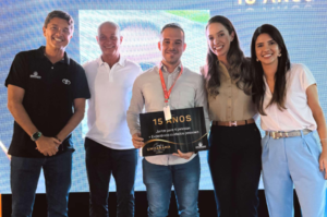 UMUARAMA CONCESSIONÁRIA REALIZA CONFRATERNIZAÇÃO DE FIM DE ANO – A sede da Umuarama Concessionárias em Goiânia foi o cenário para a confraternização de fim de ano da empresa, reunindo colaboradores e líderes, em um clima de celebração e reconhecimento, regada com coquetel e entrega de prêmios. Na foto estão o sócio-diretor Robério Pires, o CEO, Ary Jorge, o gerente financeiro, Regis Manoel e as sócias-diretoras Juliana e Luciana Pires, durante a entrega da premiação na confraternização de fim de ano da Umuarama Concessionárias