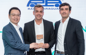 PROTAGONISMO ESG BYD 2025 – Odilon Santos Neto, CEO do grupo Odilon Santos, recebeu do presidente da BYD Brasil, Tyler Li (à esquerda) e do diretor comercial da fabricante, Bruno Paiva (à direita), o prêmio Protagonismo ESG BYD 2025, na categoria Mobilidade Sustentável, em solenidade realizada no dia 09 de dezembro, em São Paulo, em reconhecimento à incorporação de 29 ônibus elétricos articulados BYD adquiridos pela Rapido Araguaia e inseridos no BRT Leste-Oeste (Eixo Anhanguera) ao longo de 2025 e do ano 22026. Criado pela BYD, o Prêmio Protagonismo ESG valoriza empresas que adotam soluções sustentáveis por meio de tecnologias como energia solar, armazenamento inteligente, equipamentos elétricos, veículos pesados zero emissão e infraestrutura de recarga.