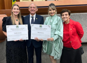 RECONHECIMENTO – Estilistas Maisa Gouveia e Natália Gouveia foram agraciadas pela Câmara Municipal de Goiânia, em uma Sessão Especial para homenagear as ‘Mulheres Admiráveis que Engrandecem Goiás’, em reconhecimento a sua contribuição para o desenvolvimento do Estado, proposta do vereador Anselmo Pereira. Ocorrida na segunda-feira, dia 31 de março, a noite foi bem prestigiada reunindo autoridades, lideranças femininas e personalidades que são destaques na sociedade goianiense. No registro, a estilista Natália Gouveia, o vereador Anselmo Pereira, a estilista Maísa Gouveia.e a ministra do TST, Delaíde Miranda Arantes