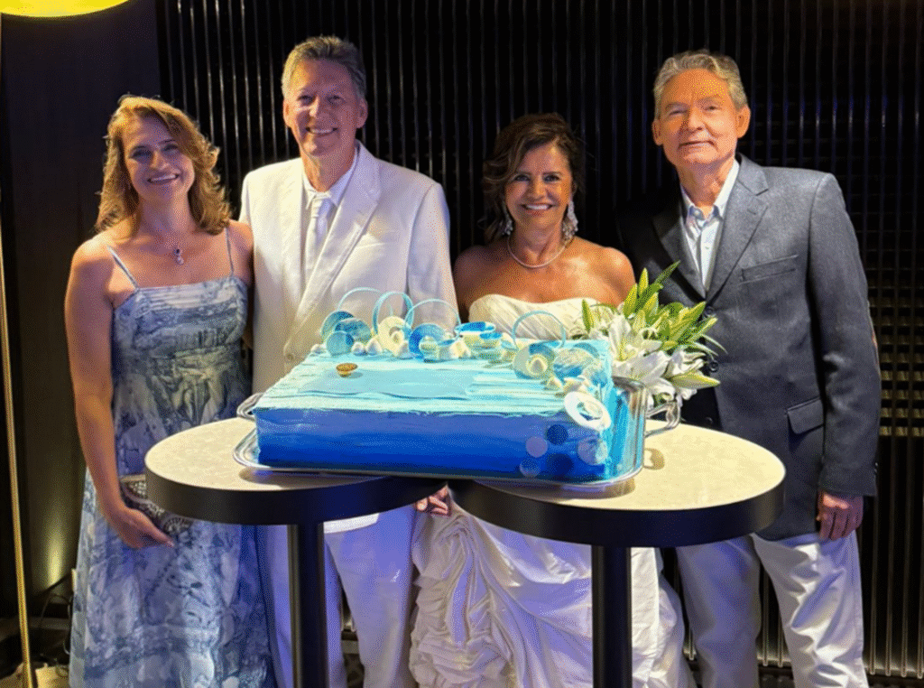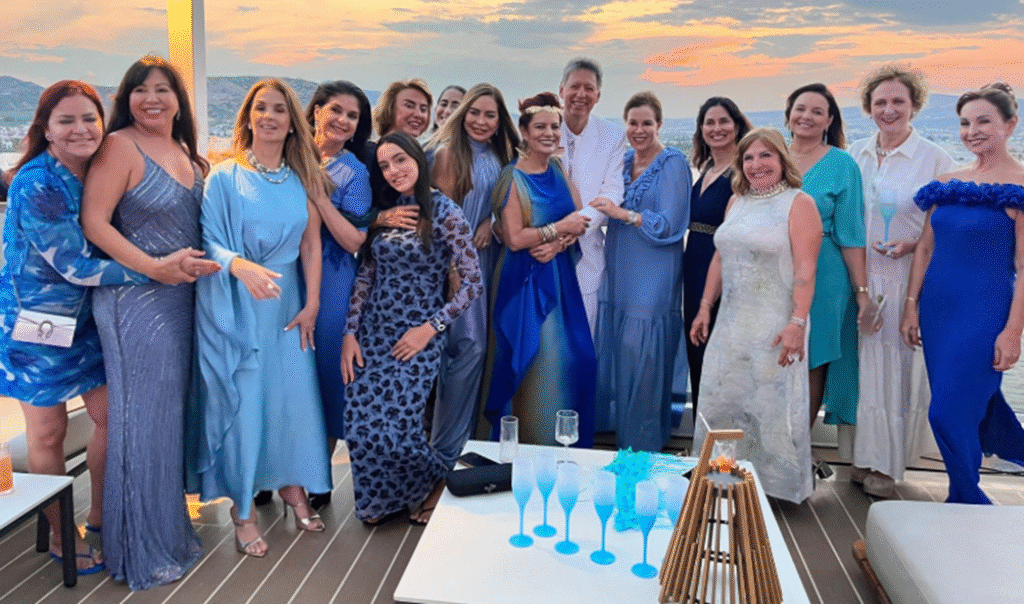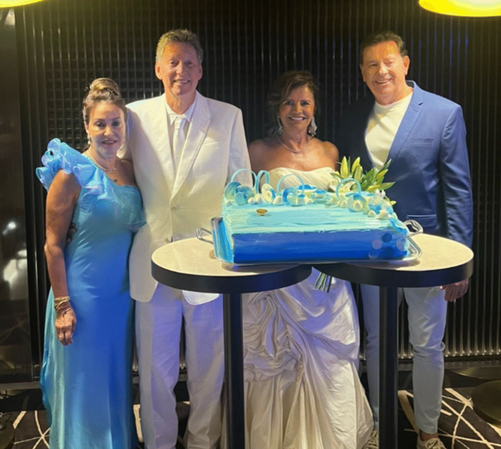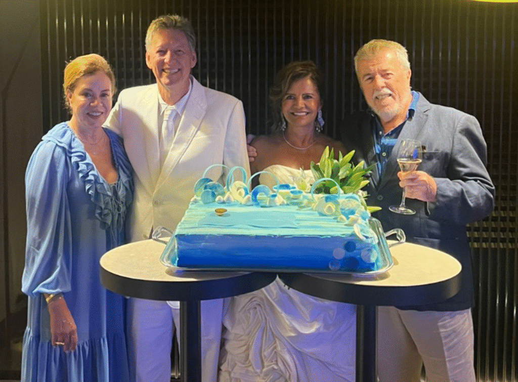 Cida Lobo rodeada com os convidados, durante o casamento, no cruzeiro, na Grécia
