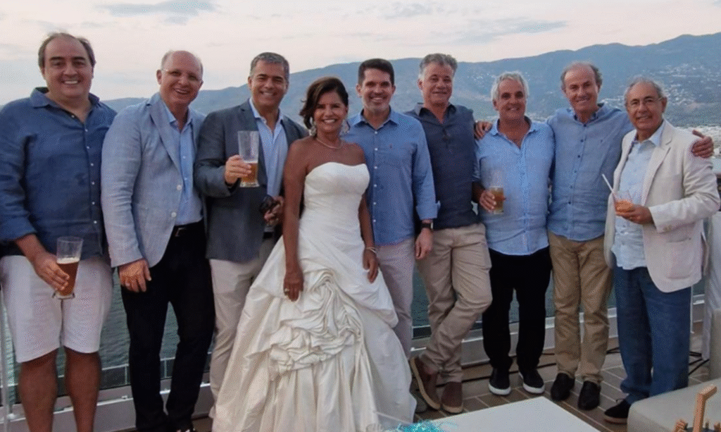 Luciano Carneiro entre as convidadas no seu casamento com Cida, na Grécia