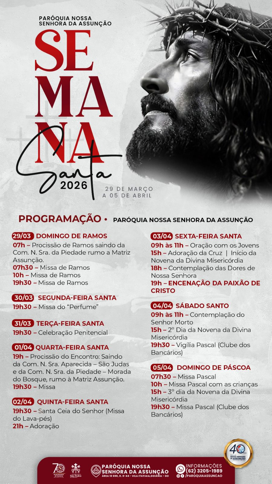 A cidade de Goiânia se prepara para vivenciar um dos momentos mais profundos de fé, cultura e emoção de seu calendário religioso. Entre os dias 29 de março e 05 de abril de 2026, a Paróquia Nossa Senhora da Assunção, localizada na Vila Itatiaia, promoverá a sua tradicional programação de Semana Santa. Neste ano, o evento ganha um contorno ainda mais especial, pois a paróquia celebra o seu jubileu de 40 anos de fundação.