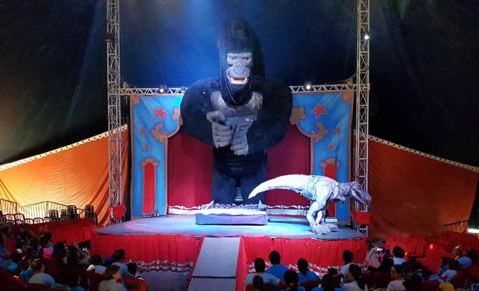 “No momento do espetáculo com o King Kong, tentamos envolver o público ao máximo, dando realidade a cena apresentada por ele. Nessa apresentação há uma encenação entre o King Kong que carrega a ‘mocinha’ e os dinossauros que saem do meio da plateia”, contou o diretor. O circo, que deverá ficar até o final de julho, tem ingressos vendidos a R$ 20 inteira e R$ 10 a meia entrada para os espetáculos que vão de terça a domingo. No final de semana o circo conta com três sessões e nos demais dias com uma sessão.