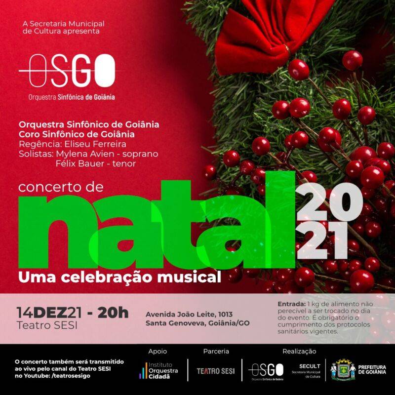 A Orquestra Sinfônica de Goiânia apresenta nesta terça-feira (14/12), às 20h, o tradicional Concerto de Natal, no Teatro Sesi. Com público limitado a 350 pessoas, os ingressos podem ser retirados antecipadamente na bilheteria do teatro. Quem puder e quiser pode contribuir com a doação de 1kg de alimento não perecível, que será doado para famílias carentes.