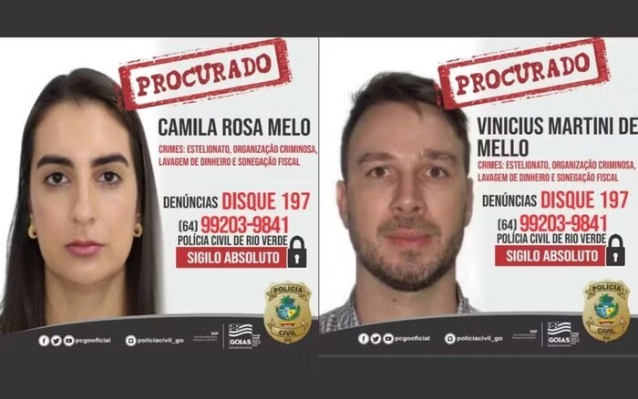 Um casal goiano acusado de aplicar golpes milionários contra produtores rurais está sendo procurado pela Interpol após ter os nomes incluídos na lista vermelha de alerta internacional. Vinícius Martini de Mello, corretor de grãos, e sua esposa, Camila Rosa Melo, são suspeitos de integrar uma organização criminosa envolvida em estelionato, lavagem de dinheiro, sonegação fiscal e prejuízos que ultrapassam R$ 40 milhões, especialmente na região de Rio Verde, no sudoeste de Goiás.
