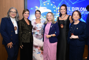 ENCONTRO EM ATO SOLENE – No registro, a diretora de Expansão Internacional da Jethro Internacional, Elisangela Dias, a sócia-fundadora do movimento Empreendedorismo Feminino Gerações & Legado, Roberta Escher, a diplomata Maris Tavares, a vereadora por Aparecida de Goiânia, Camila Rosa, a diretora Executiva de Relações Internacionais, e sócia-fundadora do movimento Empreendedorismo Feminino Gerações & Legado, Belkiss Lucas Pereira e a diplomata e advogada tributarista, Silésia Caixeta, na solenidade que oficializou os novos diplomatas e a entrega da Comenda Martin Luther King – Medal of Heart, da Jethro Internacional, ocorrida na Assembleia legislativa de Goiás (Alego), na noite de quinta-feira, dia 30 de outubro