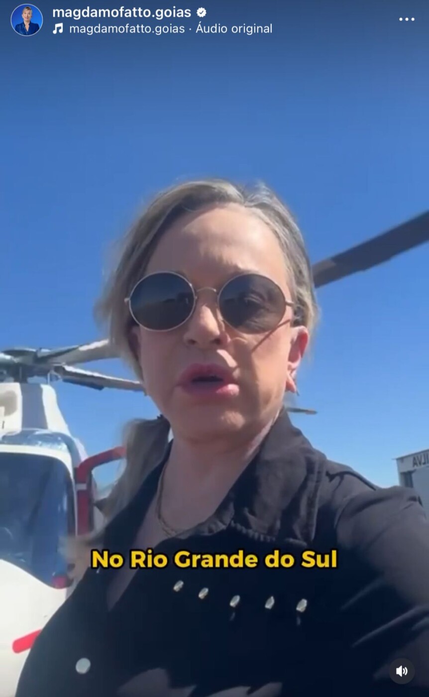 Nesta segunda-feira (13), a deputada federal Magda Mofatto (PRD-GO) informou, em suas redes sociais, que está a caminho do Rio Grande do Sul para ajudar nas enchentes que assolam o Estado. Magda leva para a região uma comitiva de médicos, caminhonetes e helicópteros para auxiliar com resgates e distribuição de doações.