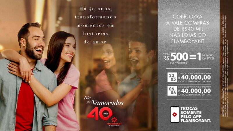 Consolidando o compromisso inédito de sortear R$ 1 milhão em prêmios até setembro de 2022, o Flamboyant Shopping segue com a sua campanha comemorativa. Para o Dia dos Namorados o próximo sorteio do cartão vale-compra no valor de R$ 40 mil reais será dia 11 de junho. Para isso, o cliente precisa apresentar notas fiscais de lojas aderentes à promoção até o dia 6 de junho de 2022. Lembrando que para os sorteios, são aceitas notas fiscais com data entre 1º de abril de 2022 a 20 de junho de 2022.