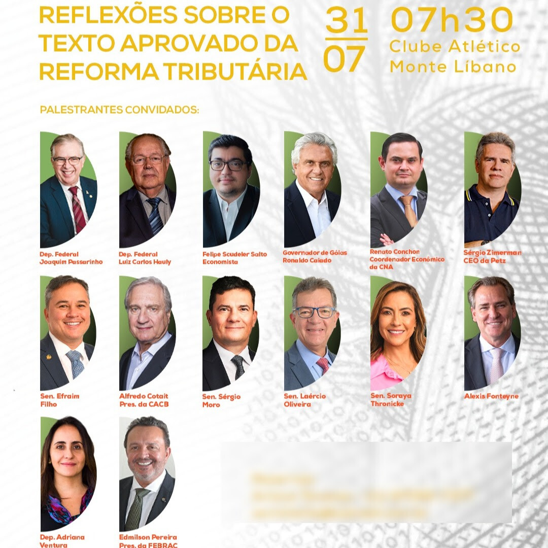 O senador Efraim Filho (UNIÃO/PB), relator do GT da reforma tributária na Comissão de Assuntos Econômicos (CAE), o economista-chefe da Warren e ex-secretário da Fazenda e Planejamento de São Paulo, Felipe Salto, o ex-ministro e senador Sergio Moro, a senadora Soraya Thronicke e o governador do estado de Goiás, Ronaldo Caiado, fazem parte do grupo de palestrantes do evento. Mais de 30 entidades dos setores de comércio, serviços e indústrias estão confirmadas.