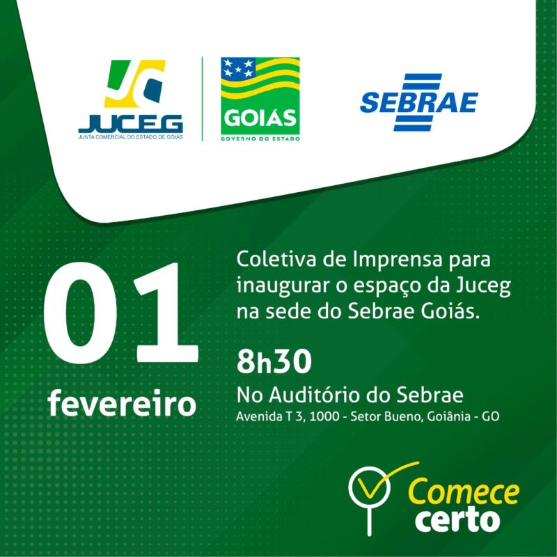 A Junta Comercial do Estado de Goiás (JUCEG) e o Serviço de Apoio às Micro e Pequenas Empresas (Sebrae Goiás) inauguram na próxima terça-feira,1/2, às 8h30, um ponto de atendimento da autarquia nas dependências da Agência Central do Sebrae, localizada na Avenida T-3, n. 1000, Setor Bueno, Goiânia (GO). A importante iniciativa faz parte do programa Comece Certo que, além de desburocratizar a abertura de empreendimentos, impulsionar novos negócios.