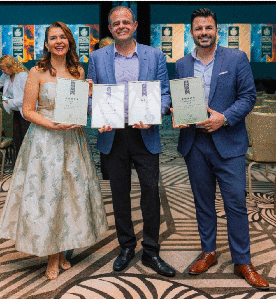 CONQUISTA DE TÍTULO DE MELHOR SHOWROOM DO BRASIL – A empresa goiana, OG Ambientes, especializada em ambientes planejados de alto padrão, comandada pelos empresários Ricardo Ponce e Roberta Gontijo, conquistou o título de Melhor Showroom do Brasil, no International Property Awards 2024–2025, categoria Best Retail Interior – Brazil, com cerimônia nacional, ocorrida no Ritz-Carlton Miami Beach. O projeto vencedor é assinado pelo designer Gustavo Cicconi, do Studio Cicconi, referência internacional com quase 20 anos de atuação. A premiação classificou, em primeiro lugar, para a etapa das Américas e Mundial que acontece em fevereiro de 2026, no tradicional Savoy Hotel, em Londres. Na foto, os empresários donos da OG Ambientes Ricardo Ponce e Roberta Gontijo e o criador do projeto inovador Gustavo Cicconi celebrando a grande conquista