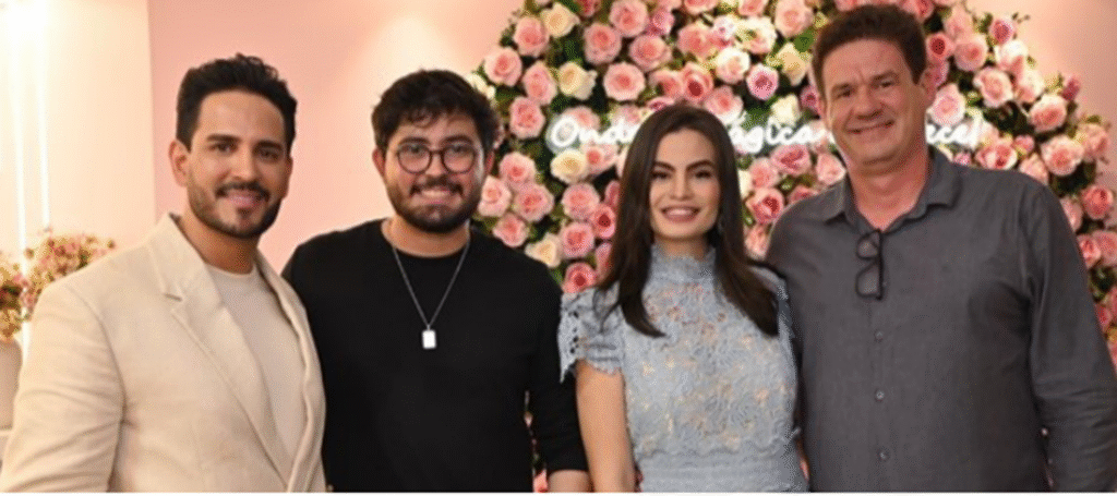 DUPLA CELEBRAÇÃO – O jornalista e empresário, Johny Cândido celebrou os 10 anos da JC Comunicação e o primeiro ano do Dream SPA & Casa de Beleza, em Goiânia. A noite reuniu amigos e parceiros na sede da casa de beleza. Na foto, o anfitrião, Johny Cândido, o cantor Manso, atração da noite, e o casal de empresários Lívia Duarte e Marcio Pavanello, comandantes do templo de beleza