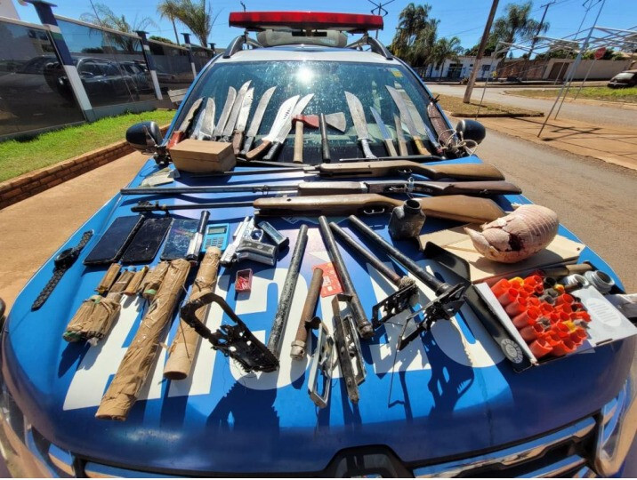 Na zona rural, próximo ao município de São João D’Aliança, a equipe do 11°CRPM/14ªCIPM recebeu denúncias de disparo de arma de fogo em uma fazenda e encontrou um arsenal. Resultado da ocorrência: 01 indivíduo preso em flagrante; 01 pistola, calibre .380, com 01 carregador com 15 munições do mesmo calibre apreendida; 02 espingardas, calibre .22, apreendidas; 01 espingarda, calibre .12, apreendida; 05 armas de fogo de fabricação caseira, “Trabuco”, apreendidas e diversas munições e cartuchos intactos e deflagrados de variados calibres apreendidos. Os objetos apreendidos e o infrator, que possui antecedentes criminais pela prática dos crimes de roubo, ameaça, injúria e posse de drogas para consumo próprio, foram apresentados na Delegacia de Polícia Civil Alto Paraíso de Goiás.