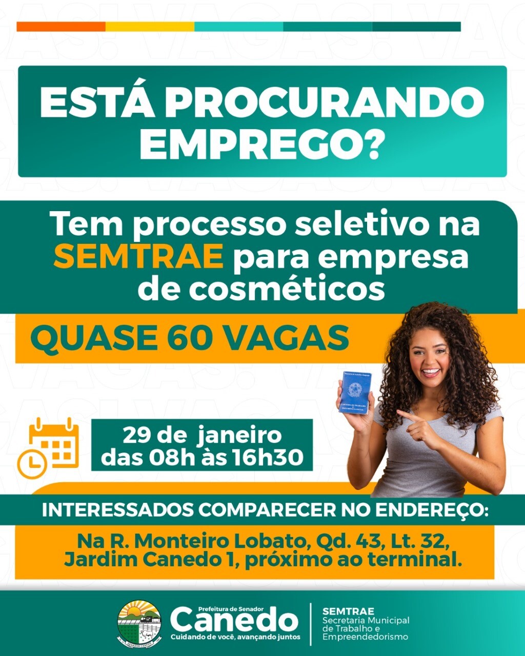 Iniciando a semana com diversas oportunidades para a população do município, a Prefeitura de Senador Canedo realiza, nesta próxima segunda-feira (29), das 8h às 16h30, por meio da Secretaria Municipal de Trabalho e Empreendedorismo (SEMTRAE), mais um processo seletivo para uma empresa de cosméticos com quase 60 oportunidades imediatas de trabalho, sendo que todas as vagas oferecidas são para nível médio.