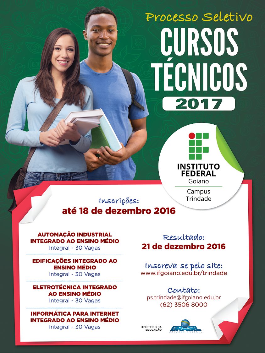 O IF Goiano – Campus Trindade publicou nesta segunda-feira (3) o Edital Nº 01/2016, referente ao Processo Seletivo 2017/1, que oferta 120 vagas em quatro cursos técnicos integrados ao ensino médio, na modalidade presencial. Os cursos são gratuitos. A inscrição é gratuita, realizada via internet no site do Campus e o prazo é de 4 de outubro até 18 de dezembro. Os cursos são Automação Industrial, Edificações, Eletrotécnica e Informática para Internet, este último com foco em desenvolvimento para dispositivos móveis. Podem pleitear vaga os estudantes que concluíram ou concluirão o ensino fundamental até 2016.