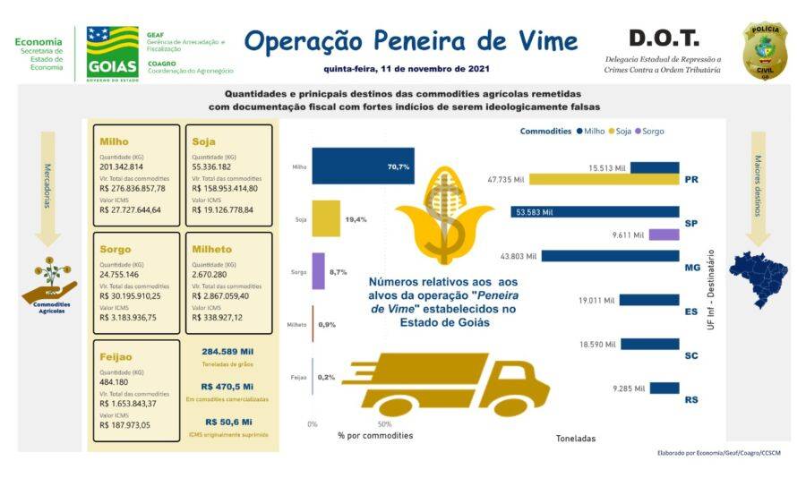 A Operação Peneira de Vime que acontece nesta manhã de quinta-feira, 11, em Goiás iniciou com o trabalho de auditores fiscais da Gerência de Arrecadação e Fiscalização (GEAF) e Coordenação do Agronegócio da Economia (Coagro), que verificando a fraude requereram a intervenção policial. A Polícia Civil, por meio da Delegacia Estadual de Repressão a Crimes Contra a Ordem Tributária (DOT), em conjunto com a Secretaria de Estado da Economia (SECON), estão cumprindo 29 mandados de busca e apreensão, 07 mandados de prisão temporária, e a suspensão das atividades de 17 empresas, bem como o bloqueio de 60 milhões de reais das contas dos investigados.