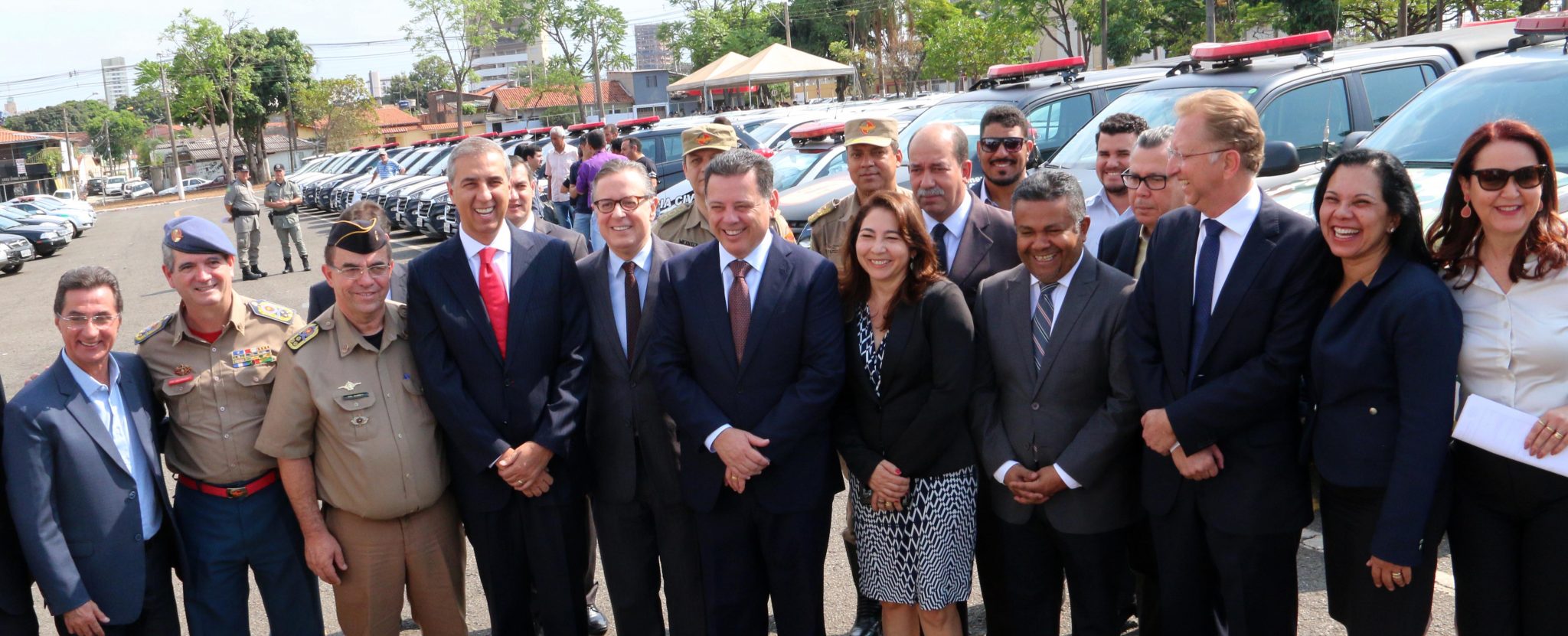 Governador Marconi Perillo, vice-governador Zé Eliton, secretário de Segurança Pública e Administração Penitenciária, Ricardo Balestreri, e a cúpula da SSPAP durante recente entrega de viaturas para forças policiais do estado: em 2016, Goiás conseguiu reduzir índices de mortes violentas intencionais em 5,2%