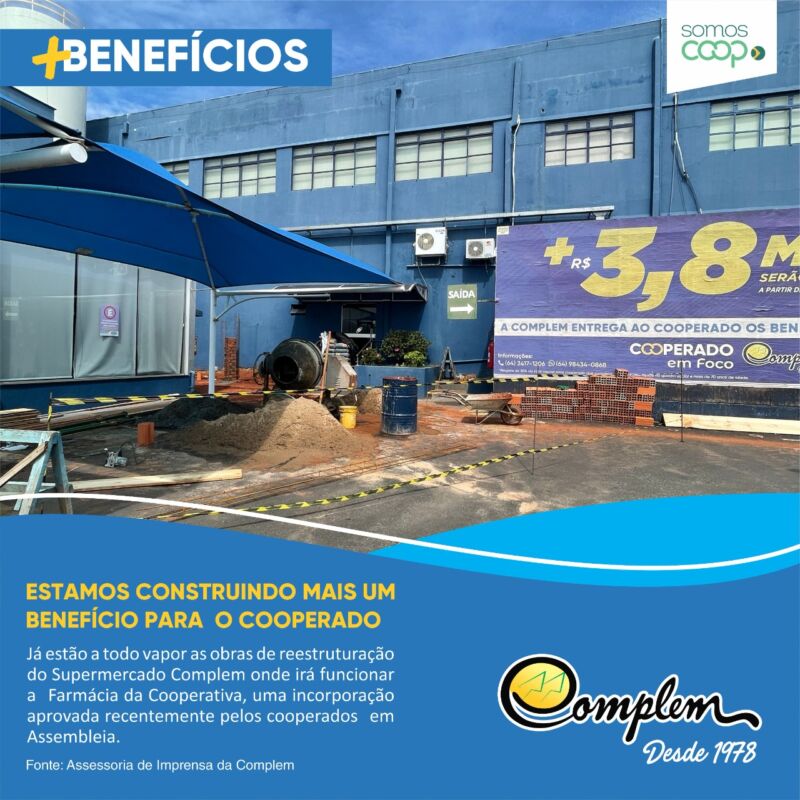 Já estão a todo vapor as obras de reestruturação do Supermercado Complem onde irá funcionar a Farmácia da Cooperativa, uma incorporação aprovada recentemente pelos cooperados em Assembleia.